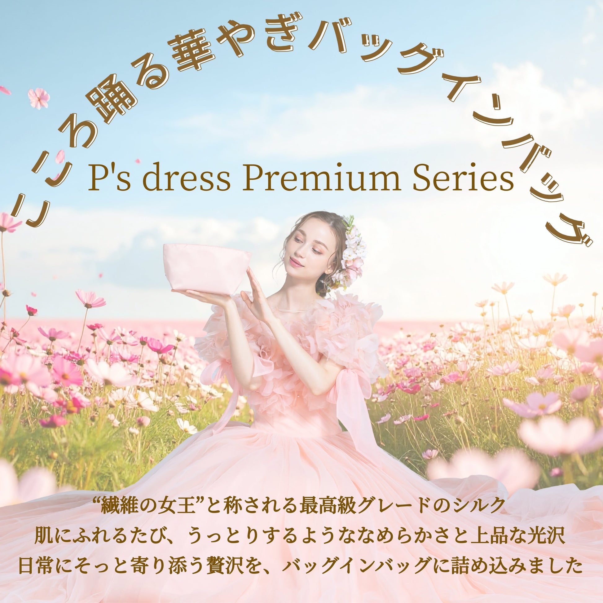 最高級のシルク素材を使用し、開発に約1年をかけて丁寧に仕上げたフラワーシリーズバッグインバッグ。<br>